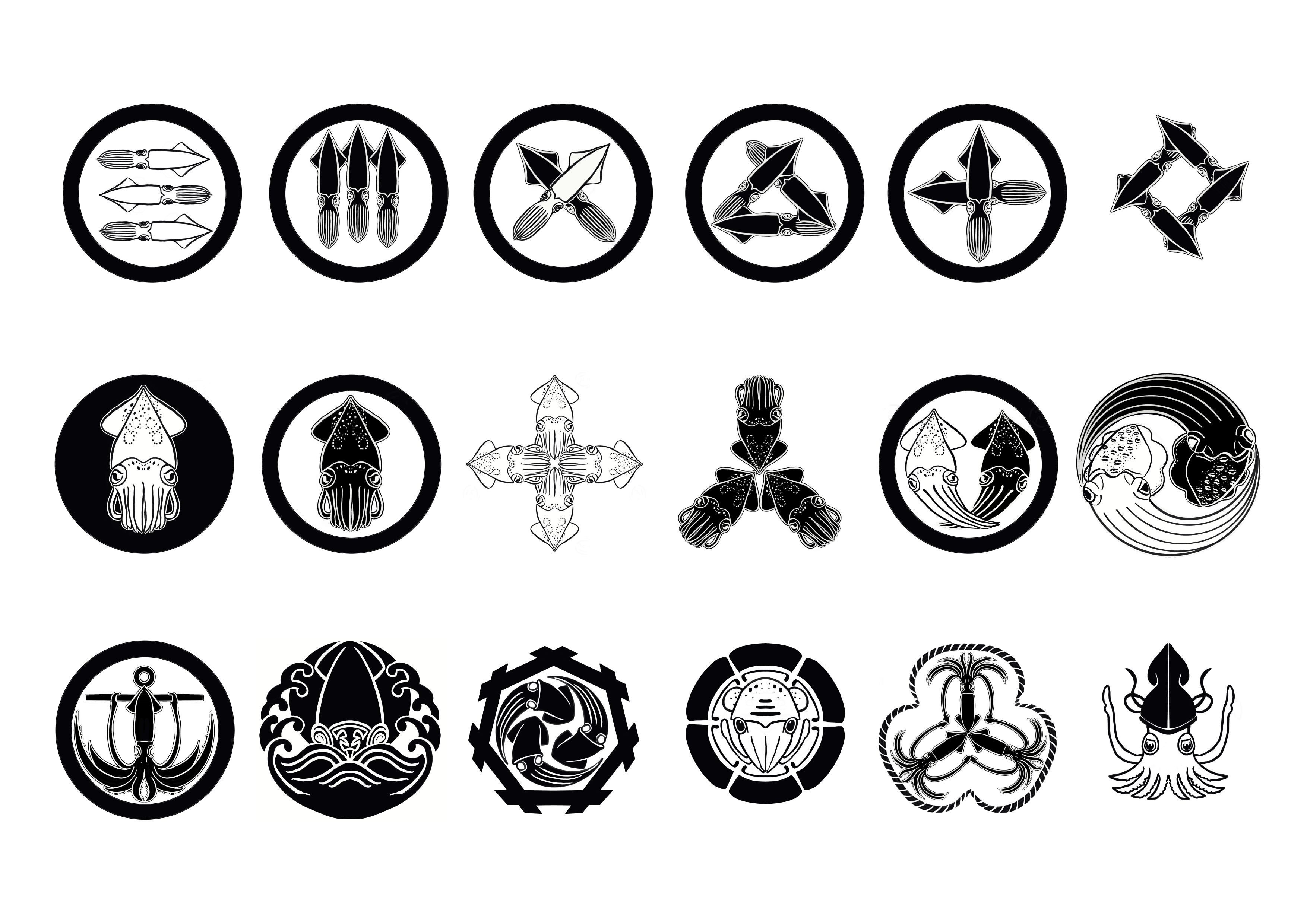「イカ紋」とは、家紋をジーっと見つめて、見つめ続けて、イカの形が浮き上がったら、それを写し取る・・という、目を細めまくるスタイルで作った「イカの家紋」です。