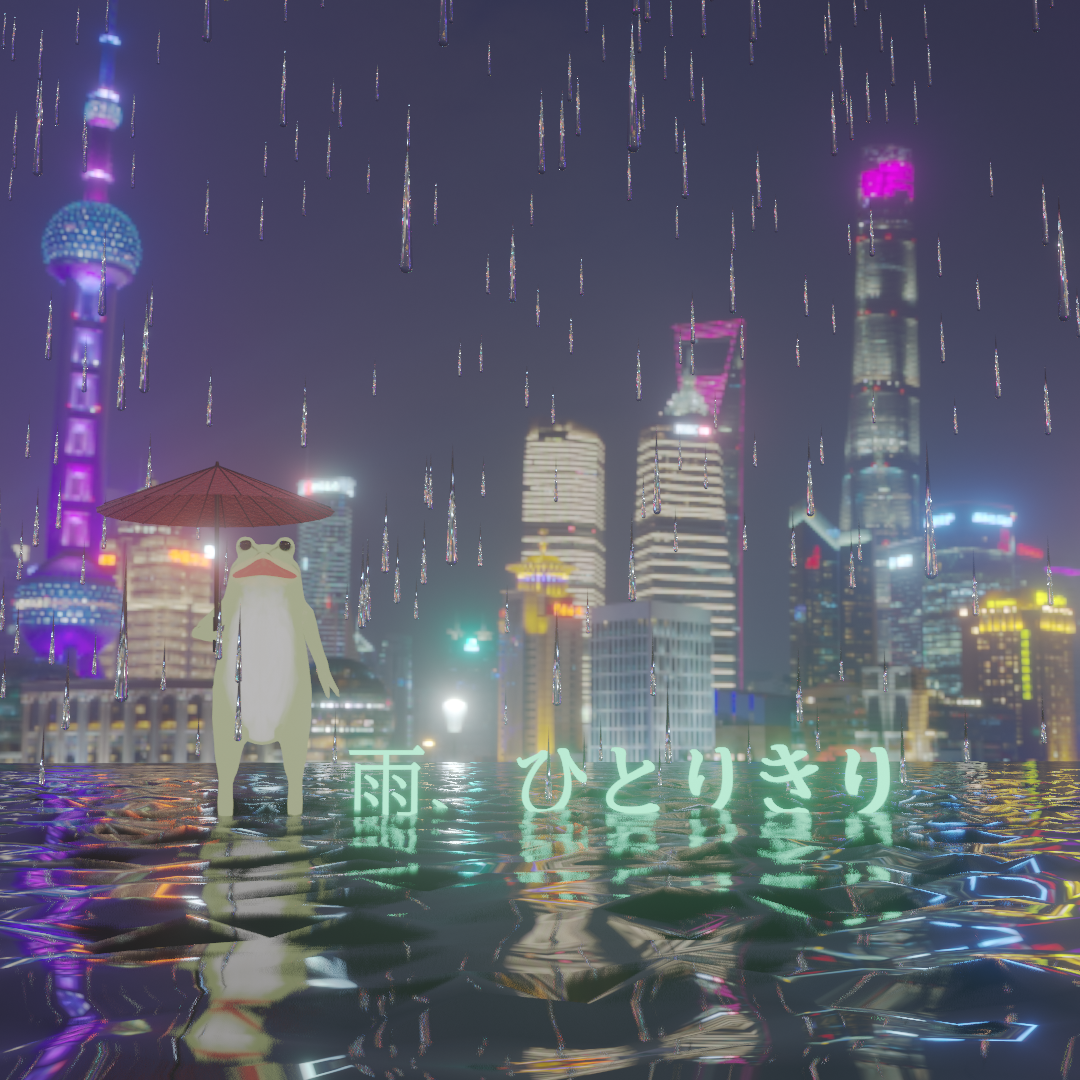 夜景と雨のセットにオリジナルキャラを置いて、動画にしています。